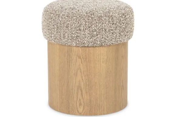 Poef George taupe 96441 van het merk Eleonora is een compacte poef met een warme en robuuste uitstraling. De ronde houten basis vormt een stevig geheel en laat de natuurlijke houtnerf mooi uitkomen. De zachte zitting in bruin bouclé voegt comfort en sfeer toe, waardoor de poef zowel praktisch als stijlvol is.