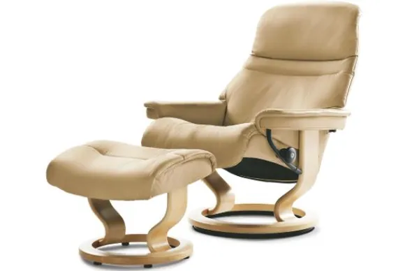 Relaxfauteuil Sunrise Classic van het merk Stressless is verkrijgbaar in alle kleuren. Tevens is de fauteuil leverbaar in stof en rundleder. Je kunt bij deze fauteuil kiezen uit diverse maten zoals Small, Medium en Large. Deze fauteuil heeft een Plus en Glide Systeem: Aan beide zijden van de fauteuil zit een knop waarmee je de weerstand van de stoel kan aanpassen naar eigen behoefte. Door de knoppen in tegengestelde richting te draaien stel je jouw ideale relaxpositie samen. Op die manier krijgt de nek en de onderrug goede onderstuening. Door de rugleuning naar voren te buigen activeer je de slaapfunctie. Op het moment dan je weer rechtop komt stelt de stoel zichzelf weer bij naar de normale stand.