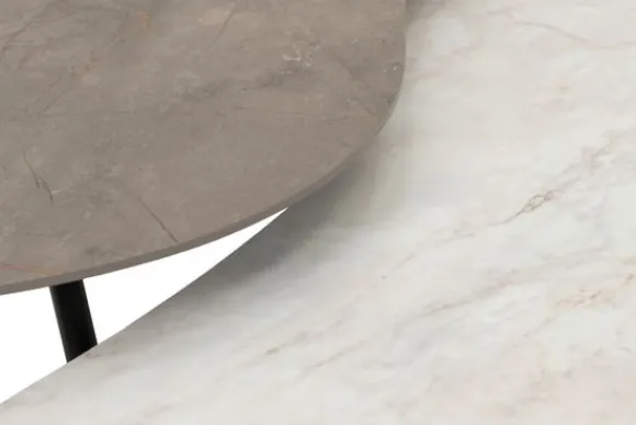 De tafelbladen hebben een organische vorm en zijn gemaakt van hpl. De kleine tafel heeft een blad in de kleur Decolegno FD77 en de grote tafel heeft een blad in de kleur Decolegno FD21.