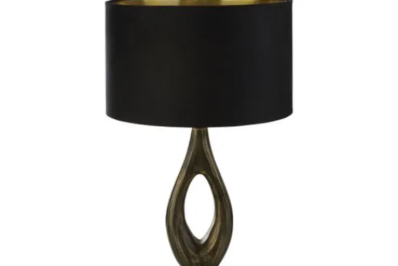 Tafellamp EU86531BK Bucklow van het merk Searchlight heeft een voetstuk gemaakt van brass. De lampenkap is gemaakt van zwart velvet.