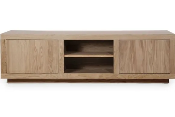 Het tv-meubel heeft twee open vakken in het midden en twee deuren aan de zijkanten. Deze indeling biedt ruimte voor apparatuur en zorgt voor extra opbergruimte uit het zicht. Het tv-meubel maakt deel uit van een met bijpassende meubels.