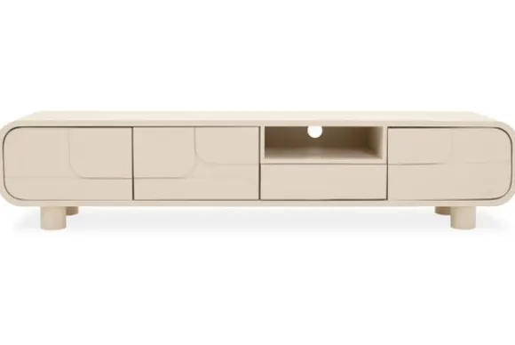 Tv-meubel Alviano NL 0154 van Tower Living is een stijlvolle en functionele toevoeging aan de woonkamer. Met een lengte van 210 cm biedt het ruim voldoende plek voor je televisie, decoratieve items en multimedia-apparatuur. De afgeronde hoeken en speelse lades zorgen voor een modern en uniek design, terwijl de beige tint een warme en tijdloze uitstraling geeft.