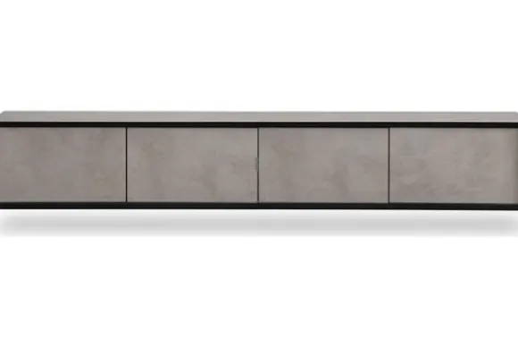 Tv-meubel Compose van het merk Ideco is direct uit voorraad leverbaar in het materiaal HPL Pebble Stone, uitgerust met 4 deuren. Deze hangende tv-meubel is een moderne blikvanger die luxe en verfijning uitstraalt. De combinatie van een lichte steenachtige afwerking met een strak zwart metalen frame geeft het meubel een stijlvolle, minimalistische uitstraling.
