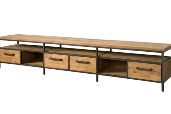 Tv-meubel Livorno FI 0107 van het merk Tower Living is gemaakt van gerecycled teakhout gecombineerd met metaal. Door de matte afwerking en dit gebruik van materialen heeft het meubel een industriële uitstraling. De tv-kast heeft vier lades en drie open vakken.