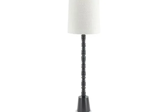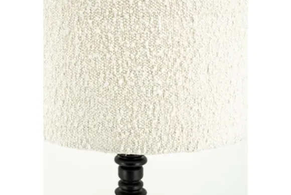 Vloerlamp Pulse 230209 van het merk By Boo bestaat uit een houten poot met sierlijke details met hieronder een metalen standaard. De lamp heeft een stoffen lampenkap in de kleur wit.