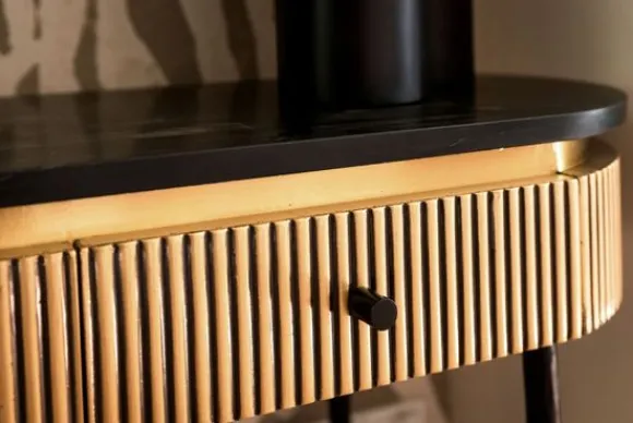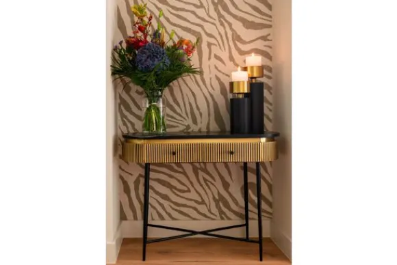 Wandtafel Ironville 211718 van het merk Richmond Interiors is een unieke wandtafel met een jaren 60 stijl dat in een nieuw jasje is gestoken. De tafel heeft een luxueuze uitstraling door zijn strakke vorm gecombineerd met het ribbelmotief in de antieke messingkleur. Het blad is gemaakt van marmer. Marmer is een duurzame steensoort en heeft een luxe en stijlvolle uitstraling. De steensoort is een natuurproduct en kenmerkt zich door de unieke afwerkingen en kan zowel grove als gladde delen bevatten. Door de kenmerkende kleurschakeringen en aders is geen product hetzelfde. Zo haal je met een marmer product dus echt iets unieks in huis. Let op: marmer is een natuursteen, daardoor kan de print van het blad iets afwijken van de foto. De wandtafel is zeer geschikt voor kleinere ruimtes, zoals de hal.