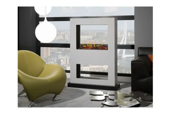 De haard is een vrijstaande haard en is daarom zeer geschikt als room-divider. Het ontwerp van deze haard geeft een mooie doorkijk waarbij het vuurbeeld van de voor- en de achterzijde te zien is.