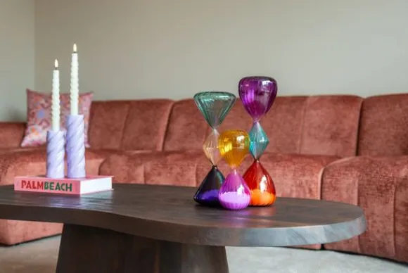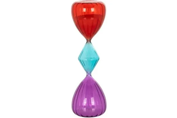 Zandloper Zandloper Jalina 212144 van het merk Richmond Interiors is gemaakt van gekleurd glas. Deze moderne zandloper is een toevoeging voor elke moderne interieurstijl en heeft een elegante maar moderne uitstraling door de verschillende kleuren van de zandloper.