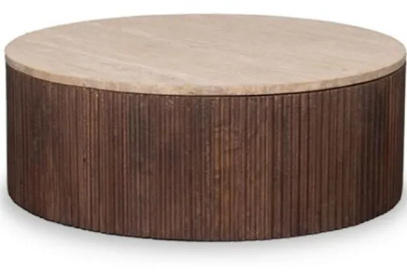 Ribble heeft een onderstel dat vervaardigd is uit Espresso Mangohout, wat zorgt voor een warme look. De lichte kleur van het travertin blad matched hier perfect bij, wat de tafel een sfeervolle uitstraling geeft
