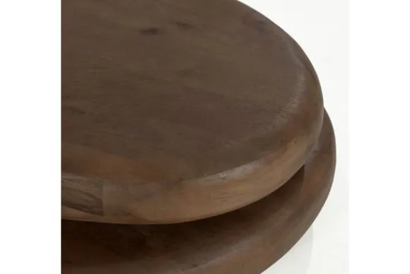 Gemaakt van massief mangohout in een diepe, warme bruine tint, bestaat deze tafel uit twee afgeronde, onregelmatig gevormde bladen die boven elkaar lijken te zweven. De zachte lijnen en ronde vormen zorgen voor een uitnodigende uitstraling en brengen een vloeiende dynamiek in je interieur.