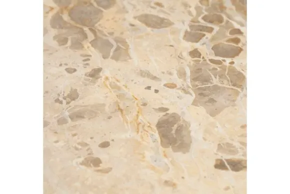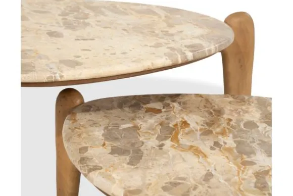 De combinatie van het gladde mangohout en het gepolijste marmer geeft de tafels een speelse uitstraling.