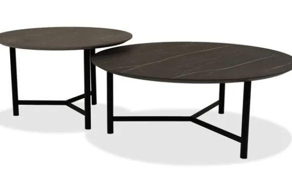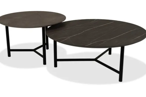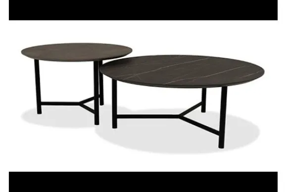 Salontafelset Cirello van het merk Casa Varello bestaat uit twee salontafels met de volgende afmetingen: H38 x Ø60 cm en H32 x Ø80 cm.