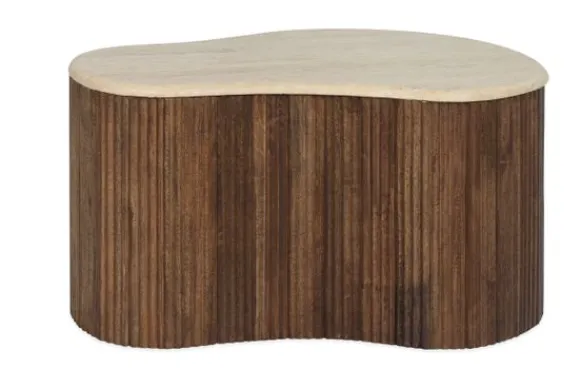 De basis van de tafel is gemaakt van mango hout, bekend om zijn duurzaamheid en mooie, warme uitstraling. Het hout is verticaal geribbeld, wat zorgt voor een mooie textuur en een speelse interactie tussen het strakke travertin en het natuurlijke hout. Deze tafel is perfect voor liefhebbers van natuurlijke materialen en organische vormen, en zal zeker een blikvanger zijn in elke woonkamer.
