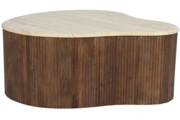 De basis van de tafel is gemaakt van mango hout, bekend om zijn duurzaamheid en mooie, warme uitstraling. Het hout is verticaal geribbeld, wat zorgt voor een mooie textuur en een speelse interactie tussen het strakke travertin en het natuurlijke hout. Deze tafel is perfect voor liefhebbers van natuurlijke materialen en organische vormen, en zal zeker een blikvanger zijn in elke woonkamer.