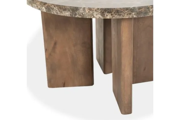 Salontafel Lando 96334 small van het merk Eleonora is een krachtige combinatie van aardse elegantie en hedendaags design. Het ronde tafelblad is vervaardigd uit gepolijst bruin marmer, met een rijke, natuurlijke adering die een subtiel spel van licht en schaduw creëert. De warme glans van het marmer geeft de tafel een luxe uitstraling, als een stille echo van klassieke grandeur. De robuuste poten in gelakt mangohout bieden niet alleen een solide basis, maar zorgen ook voor een mooi contrast met het gladde blad. Elk stuk hout toont zijn eigen unieke nerven en nuances, wat van iedere tafel een karaktervol en individueel object maakt. De geometrische vormgeving van het onderstel geeft de tafel een moderne flair, terwijl de ronde lijnen zorgen voor een zachte, uitnodigende uitstraling.