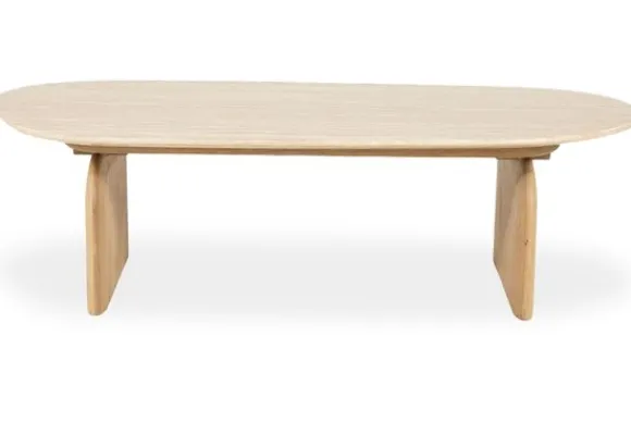 Salontafel Lova 96597 van het merk Eleonora is gemaakt met een blad van travertin en een onderstel van eikenhout. Het blad heeft een langwerpige organische vorm met afgeronde hoeken. Het oppervlak toont lichte kleurnuances en een zichtbare steenstructuur. Het onderstel bestaat uit twee stevige eiken delen die aan beide zijden geplaatst zijn. Dit zorgt voor een stabiele en solide basis.