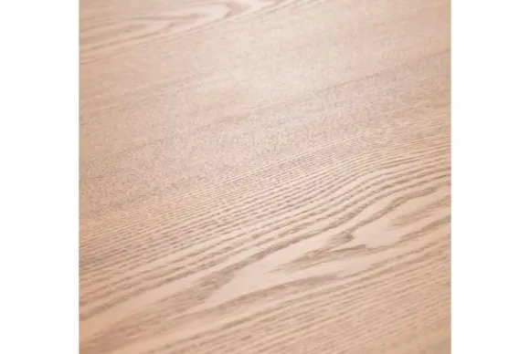 Het tafelblad is vervaardigd uit essenhout fineer, waarbij de natuurlijke nerfstructuur subtiel door het oppervlak danst en een warme, tijdloze uitstraling creëert. De lichte houttint geeft de tafel een serene elegantie.