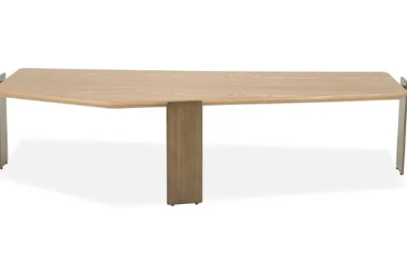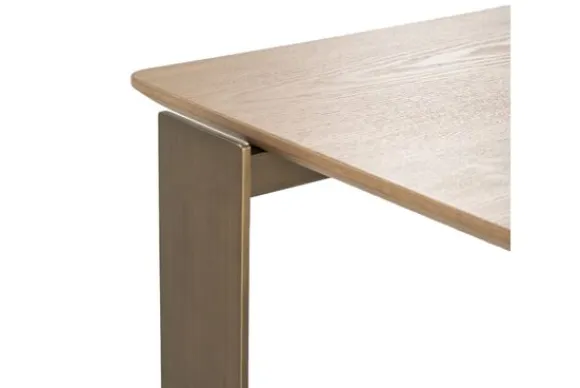 De geometrische vorm van het blad maakt salontafel Robert tot een opvallend middelpunt in de woonkamer. De strakke lijnen en afgeronde hoeken zorgen voor een verfijnd spel tussen zachtheid en structuur. Het onderstel, met zijn robuuste en rechte poten in een warme bronskleurige afwerking, vormt een krachtig contrast met het lichte hout. Deze balans tussen natuurlijke warmte en industrieel karakter verleent de tafel een luxueuze, eigentijdse uitstraling.