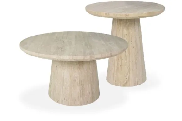 Salontafelset Aime van het merk Eleonora is geheel gemaakt van travertin met een nano coating. Travertin is een mooi en duurzaam natuurlijk sedimentair gesteente, gemaakt van calciumcarbonaat, dat vaak gebruikt wordt voor tafelbladen. Het heeft een unieke uitstraling met variaties in kleur en textuur. Hoewel het redelijk stevig is, kan travertin gemakkelijk krassen oplossen van scherpe voorwerpen of zware impact. Deze set bestaat uit twee tafels met de volgende afmetingen: B70 x D70 x H38 cm en B45 x D45 x H45 cm.