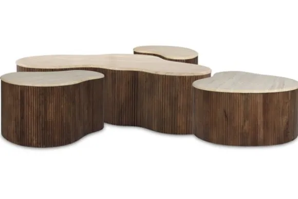 De basis van de salontafelset is gemaakt van mango hout, bekend om zijn duurzaamheid en mooie, warme uitstraling. Het hout is verticaal geribbeld, wat zorgt voor een mooie textuur en een speelse interactie tussen het strakke travertin en het natuurlijke hout. Deze set is perfect voor liefhebbers van natuurlijke materialen en organische vormen, en zal zeker een blikvanger zijn in elke woonkamer.