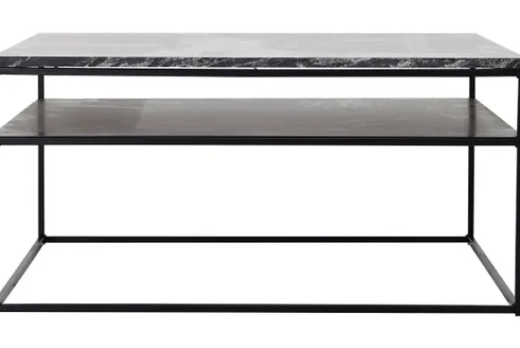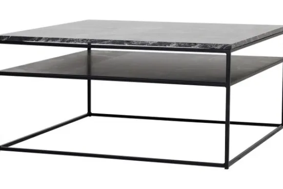 Deze salontafel wordt standaard uitgevoerd met een marmere blad en met zwarte metalen poten.