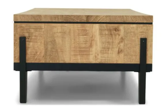 Salontafel Lucania – Union van het merk Lamulux is uitgevoerd in de kleur Mango en heeft een stoere uitstraling. De combinatie van hout en metalen poten en handgrepen geeft de tafel een robuust karakter. Onder het blad bevindt zich één lade en daarnaast twee open vakken voor praktische opbergruimte.