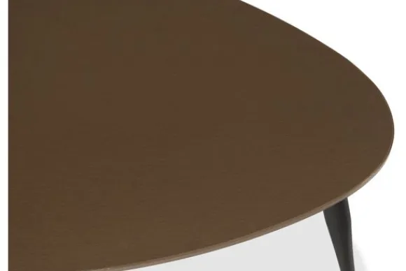 Salontafelset Madoka van het merk Lamulux bestaat uit 2 strakke tafels met de afmetingen B86 x D67 x H50 cm en B71 x D52 x H43 cm. De organische salontafels hebben een zwarte metalen onderstel met een koperkleurig tafelblad met verschillende texturen.