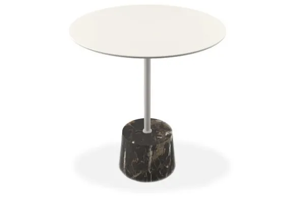 Salontafel Katleen van het merk Leska combineert luxe materialen met een strak en eigentijds ontwerp. Het metalen blad in een verfijnde, matte afwerking rust op een stevige voet van echt marmer. Die robuuste marmeren basis, met zijn natuurlijke adering en diepe kleurtonen, zorgt voor een stijlvol contrast en een luxe uitstraling.