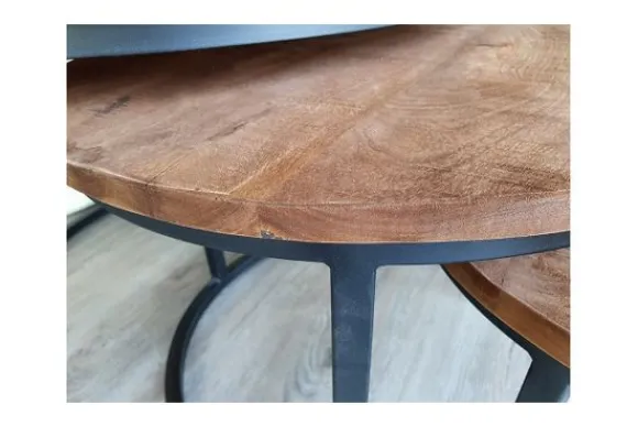 Salontafelset Jerrel Black van het merk :joy: heeft een blad van mangohout en poten van gecoat staal. Deze combinatie zorgt voor de stoere uitstraling van deze tafels. Mangohout is een duurzame houtsoort, heeft een fijne nerf en is uniek omdat elk stuk er net iets anders uitziet. Afmetingen van de tafels zijn: Ø73 x H44 cm, Ø55 x H40 cm en de kleinste tafel is Ø43 x H30 cm.