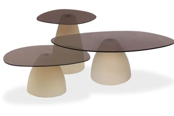 Salontafelset Mylon van het merk Brix is een unieke tafelset met een organische vorm. Het tafelblad is gemaakt van bruin glas. De tafelpoot is van beton gemaakt. Beton is een duurzaam en veelzijdig materiaal. Deze tafel is makkelijk schoon te maken met een zachte, vochtige doek. Deze set bestaat uit drie tafels met de volgende afmetingen: B76 x D86 x H35 cm, B110 x D65 x H35 cm en B43 x D50 x H40 cm.