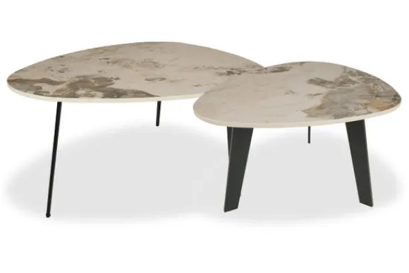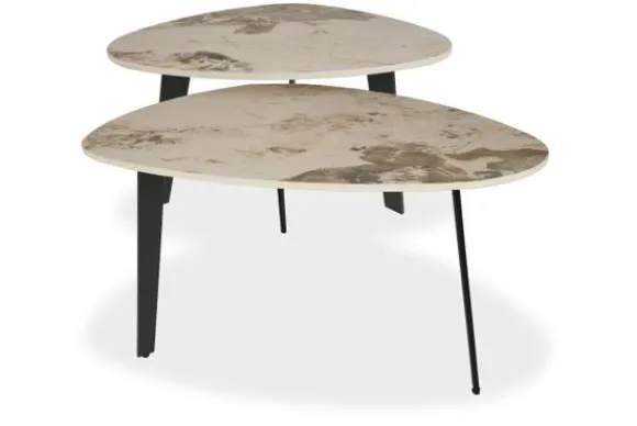 Salontafelset Tove van het merk Maison Royale is een subtiele dialoog tussen klassieke elegantie en hedendaags minimalisme. De unieke, organisch-driehoekige vormen worden versterkt door het keramieken tafelblad met marmerlook, dat met zijn natuurlijke aders en warme beige tinten een luxueuze uitstraling geeft. Dankzij het slanke, asymmetrische onderstel oogt de set licht en luchtig, terwijl het keramiek garant staat voor duurzaamheid: krasbestendig, vormvast en onderhoudsarm.
