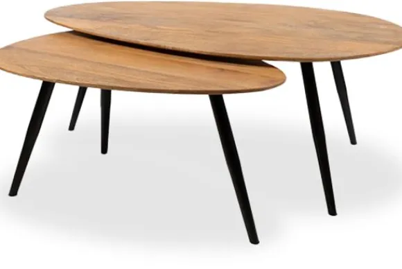 De tafelbladen zijn gemaakt van massief mangohout, wat door de vele kleurschakeringen en ongelijkheden in het oppervlakte van het hout, een uniek meubelstuk opleverd. Deze tafels hebben elk 3 slanke metalen poten die taps aflopen.