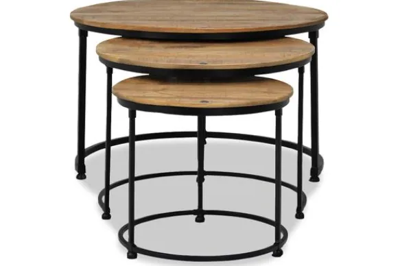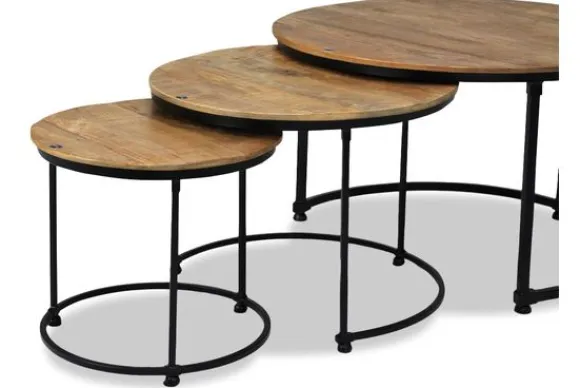 Salontafelset Esprezzo van het merk Old Wood is een set van drie unieke tafels. De tafels worden handgemaakt, hierdoor is iedere tafel uniek en anders qua kleur en afwerking. De tafels zijn volledig in elkaar te schuiven. De tafels hebben een zwart ijzeren onderstel .