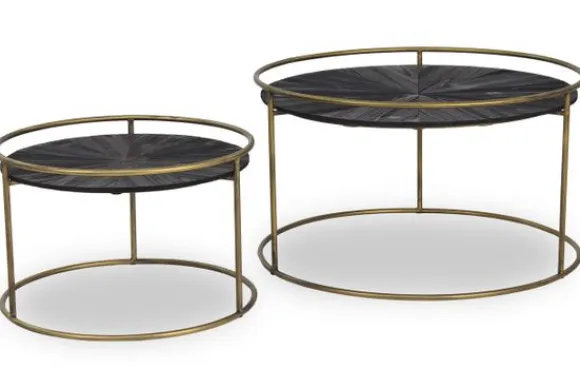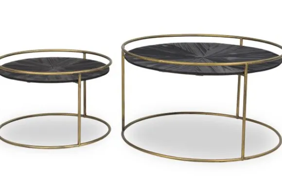 Salontafelset Caly Black wood 706936 van het merk PTMD is een set van twee tafels met een bijzonder mooi design. Het tafelblad is vervaardigd van MDF dat is afgewerkt met zwart Firwood. In combinatie met het goudkleurige frame hebben de tafels een chique uitstraling. De afmetingen van de salontafels zijn: B55 x D55 x H35 cm en B76 x D76 x H43 cm.