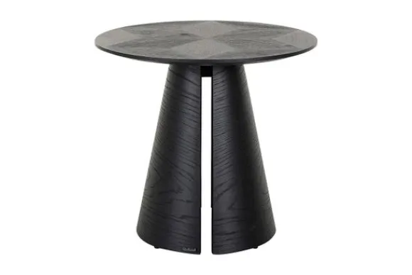 Het ronde blad van massief eikenhout heeft een verfijnd grafisch patroon, wat samen met de kegelvormige basis zorgt voor een speelsheid in de ruimte.