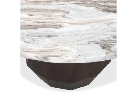 De ronde tafel combineert een robuuste conische poot van mangohout met een verfijnd blad van echt marmer. Mangohout kun je herkennen aan de vele kleurschakeringen en natuurlijke oneffenheden, van warme donkerbruine tonen tot een subtiele rode of gelige gloed. Hierdoor is elk exemplaar uniek en bovendien duurzaam.