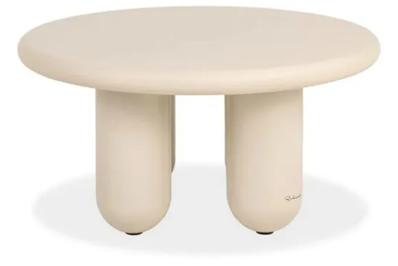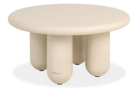 De tafel is uitgevoerd in een zachte crèmekleur en valt direct op door zijn vier stevige cilindervormige poten die de perfect ronde top ondersteunen. Dit ontwerp oogt hedendaags en krachtig, zonder zijn elegantie te verliezen.