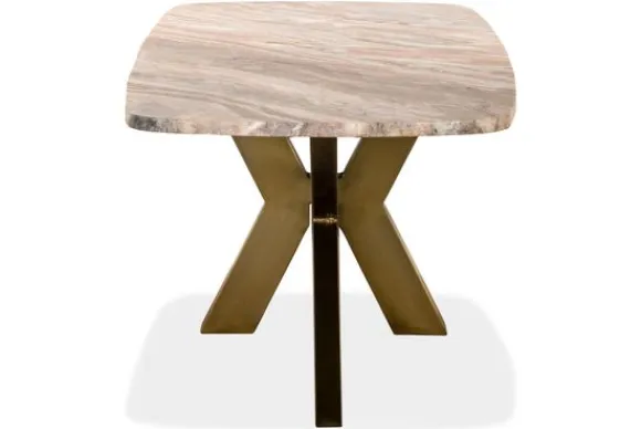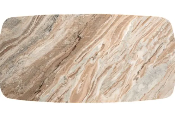 Het marmeren blad straalt een stijlvolle luxe uit, met zijn zachte aders en unieke patroonvariaties. Geen twee bladen zijn exact hetzelfde, een waar natuurproduct dat een verfijnde dialoog tussen licht en textuur op tafel brengt. De zachte kleurschakeringen in het marmer vangen het licht op een manier die elke ruimte subtiel doet oplichten.