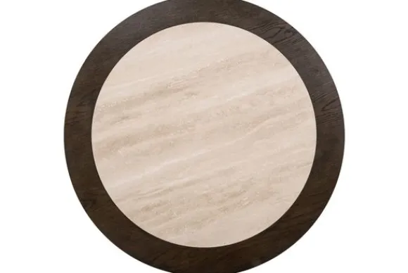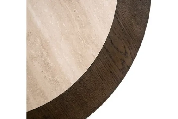 Het stevige houten onderstel, afgewerkt met eikenfineer, geeft de tafel een robuuste basis, terwijl het lichte blad een vleugje luxe toevoegt. Het tafelblad is gemaakt van travertin keramiek.
