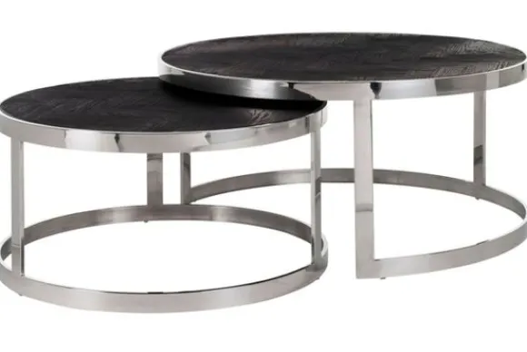 Salontafelset Blackbone 210379 van het merk Richmond Interiors heeft een eiken fineer blad met een onderstel van verchroomd staal. Doordat de twee tafels verschillende maten hebben kan de kleinere eronder geschoven worden.