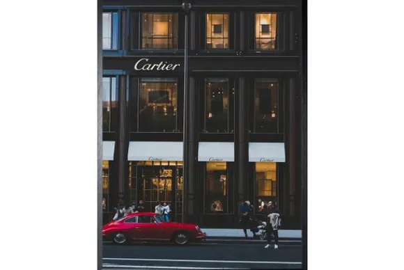 Art Print Cartier Gevel FA-226 van het merk Luxe Framing Art is een luxueuze print waarop een winkelgevel van Cartier afgebeeld staat. Het zwarte gebouw straalt luxe uit. Voor de winkel staat een rode oldtimer geparkeerd. Deze print is in verschillende afmetingen vekrijgbaar en wordt standaard met een zwarte lijst geleverd.