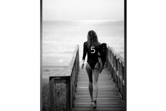 Art Print Surfen FA-101 van het merk Luxe Framing Art is een zwart-witprint waarop een mevrouw staat die over een pier richting de zee loopt. Onder haar arm heeft ze een surfboard. Deze Art Print is in verschillende afmetingen verkrijgbaar en wordt standaard geleverd met een zwarte lijst.