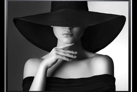 Art Print Zonnehoed ISB311 van het merk Luxe Framing Art is verkrijgbaar in verschillende afmetingen. Op deze zwart-witprint is een vrouw met een grote zwarte zonnehoed afgebeeld. De hoed bedekt het bovenste gedeelte van haar gezicht. Deze Art Print wordt standaard met een zwarte lijst geleverd.