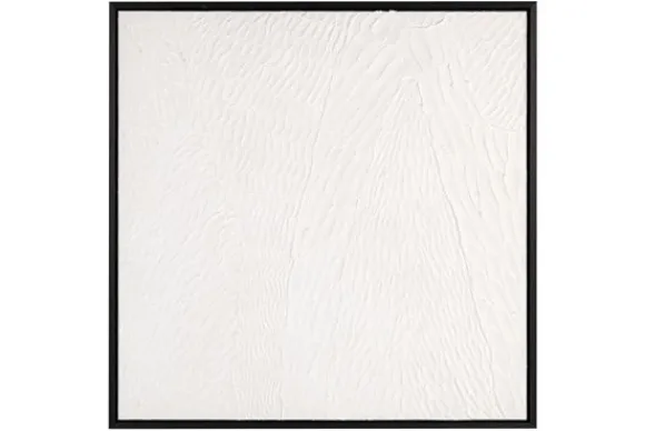De gipslaag zorgt voor een sculpturaal effect, terwijl de warme witte tint rust en verfijning uitstraalt. Het zwarte frame omlijst het werk met een modern en stijlvol contrast.