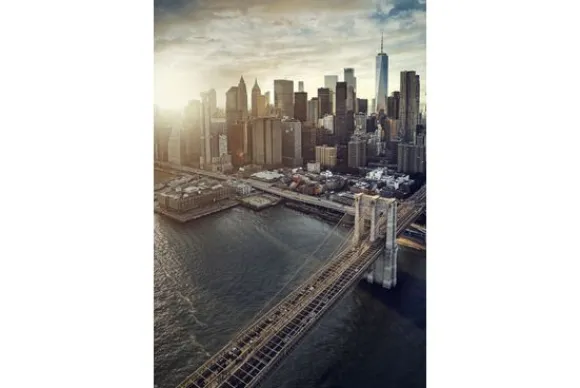 Glasschilderij Brooklyn Bridge 080120-1110 van het merk Ter Halle toont de Brooklyn Bridge van bovenaf met de stad en skyline op de achtergrond. De foto met industriële kleuren past goed in moderne en strakke interieurs.