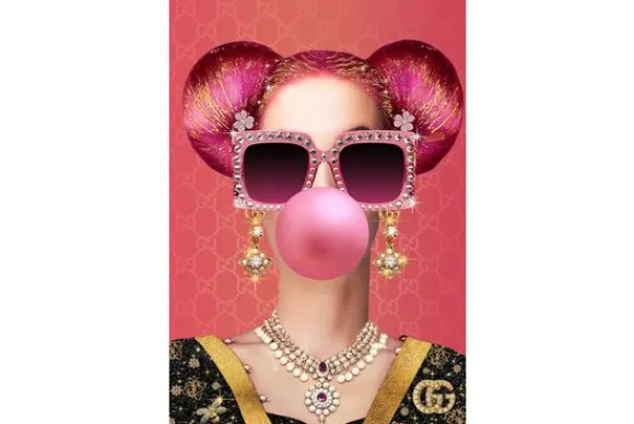 Glasschilderij Bubblegum 080120C-812 van het merk Ter Halle vult de ruimte met een explosie van kleur. Afgebeeld is een dame met kauwgom op een felroze achtergrond. Op haar fonkelende kleding is het Gucci logo te zien.