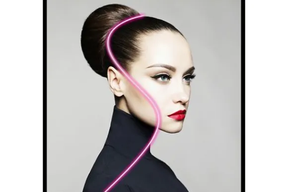Glasschilderij Vrouw Met Knot 080080LED-004 van het merk Ter Halle toont een elegante vrouw met een strakke knot en rode lippen, waarbij een subtiele roze lichtlijn langs haar profiel loopt en zorgt voor een moderne en verfijnde uitstraling.