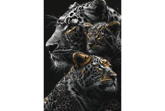 Glasschilderij Panters met Gouden Tinten van het merk Ter Halle is een adembenemend kunstwerk van 80 cm breed en 120 cm hoog, uitgevoerd met gouden details.