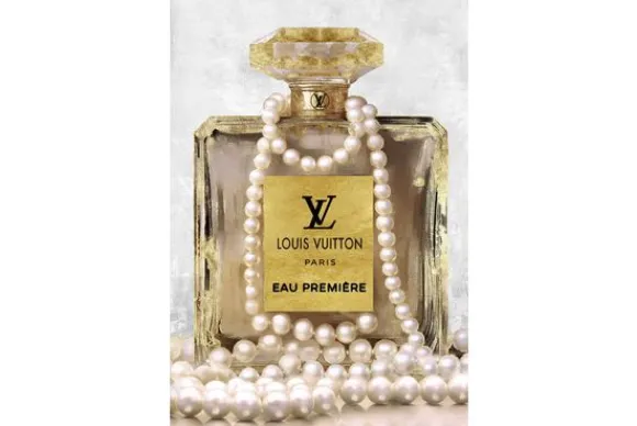 Glasschilderij Parfumfles Goud 080120C-806 van het merk Ter Halle vult de ruimte met het luxegevoel van Louis Vuitton. Afgebeeld is een glazen parfumfles met een ketting van stralende parels, wat de luxe en verfijning van het merk benadrukt.