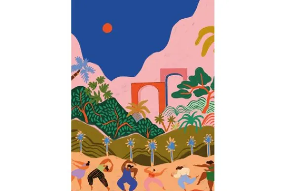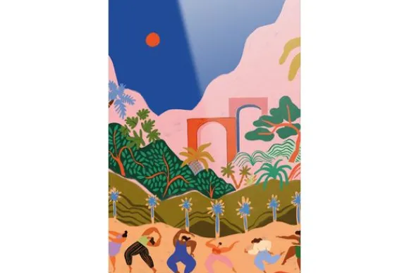 Glasschilderij Dancing in Paradise van het merk Urban Cotton is een levendig kunstwerk vol expressie en beweging. De afbeelding toont dansende figuren in een tropisch fantasielandschap, omgeven door kleurrijke bomen, glooiende heuvels en een diepblauwe hemel met een vurige rode zon. Perfect voor een modern interieur met een boho touch of een kleurrijk eclectisch interieur waar kunst centraal staat. Een ode aan vrijheid, vrouwelijkheid en fantasie.